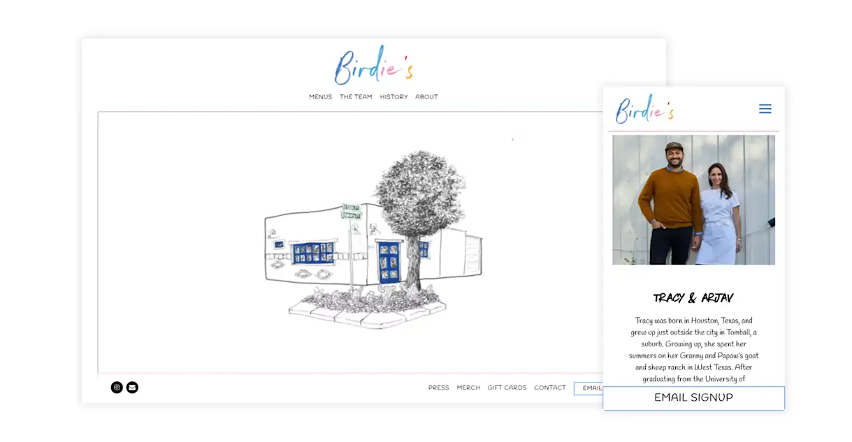 Less than six months after Birdie's opened on 12th Street in East Austin, the New York Times dubbed it one of the 50 most exciting restaurants in America. Beyond the world-class menu, much of Birdie's charm comes from its neighborhood feel and unassuming nature; its Instagram simply describes it as "a little restaurant & wine bar." The design of its website captures that spirit perfectly, using minimalist illustrations and casual fonts while telling the story of co-owners (and partners) Tracy Malechek and Arjav Ezekiel, who met in New York while working at Gramercy Tavern.