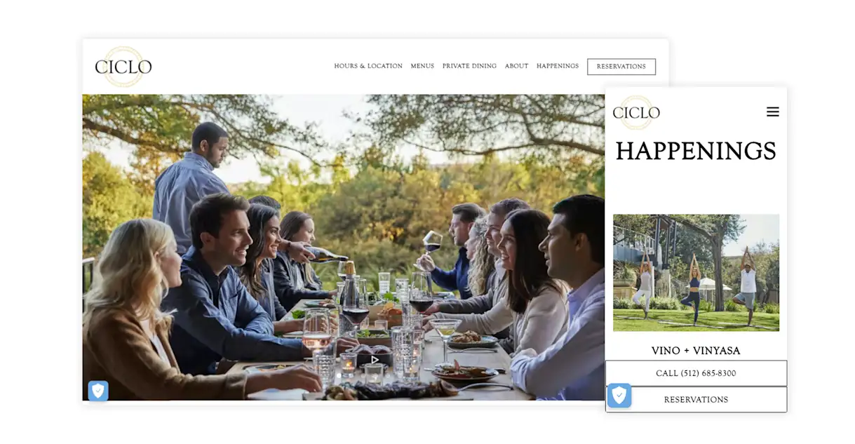 Located at the Four Seasons with a patio that overlooks the river, Ciclo is one of Austin's best upscale restaurants and event spaces. Its website has an appropriately polished look and feel, including serif fonts, sharp lines and gold-trimmed illustrations. Visitors looking to host events can learn about private dining spaces, while visitors looking to attend events can browse upcoming happenings such as yoga-and-wine classes, signature menus and dinner theater.