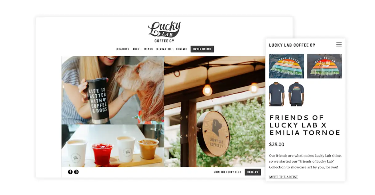 Lucky Lab Coffee began as a little black coffee truck, but has grown to multiple brick-and-mortar locations across Austin. Since its earliest days, the brand has been synonymous with two things: coffee and dogs. Its name, logo, signage and packaging all reference labrador retrievers, and its website is no different, putting lifestyle photos of coffee and dogs front-and-center. The restaurant's passionate audience also makes selling dog-themed merchandise a natural source of revenue, and Lucky Lab's website includes a merchandise store to sell apparel, drinkware and more directly online.