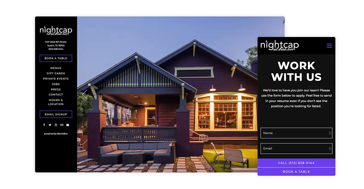 For restaurants that appeal to out-of-town partygoers — as most venues on 6th Street do — a website is essential for branding and research. Potential guests will likely visit the site before deciding where to dine, drink or dance when they go out. Nightcap uses its website to leave a strong first impression, positioning itself as an upscale bungalow that is fun but also sophisticated. It also includes a Jobs page where potential employees can easily apply, something all restaurants need given the state of the industry workforce.
