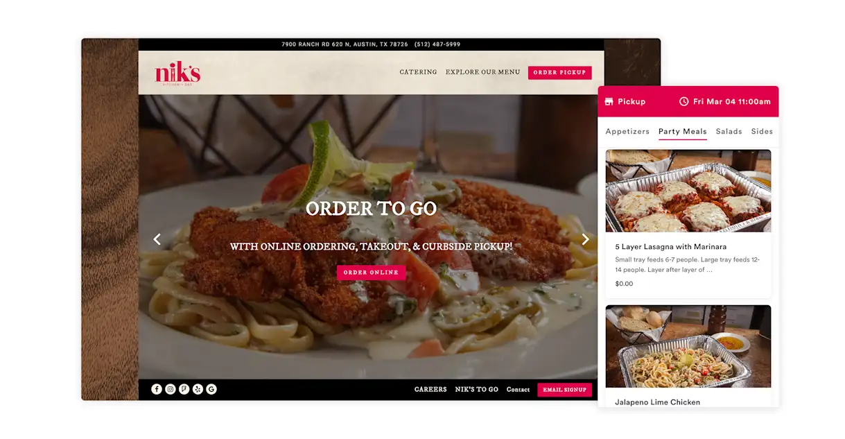 A short drive from the River Place Nature Trail, Nik's Italian Kitchen is a popular place to wind down with a cold beer and comfort food after a hike. It's also a popular off-premises destination for Italian food lovers across Austin. Understanding this, its website is designed to maximize online commerce, with homepage CTAs that funnel users to place online orders. In addition to direct online ordering, its website uses BentoBox Pre-Order & Catering to simplify the process of placing and fulfilling bulk orders.