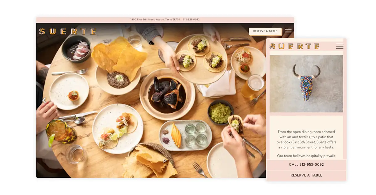 Suerte means "lucky" in Spanish, but the success of chef Fermin Nunez's East Austin restaurant has been driven by skill, passion and craft. It has also been supported by a beautiful website with bright colors, compelling descriptions and stunning restaurant photography. The website features traditional Mexican art and describes its focus on masa (a traditional Mexican ingredient) but blends it all with modern design — the same way its menu fuses traditional Mexican techniques with local Texas ingredients.