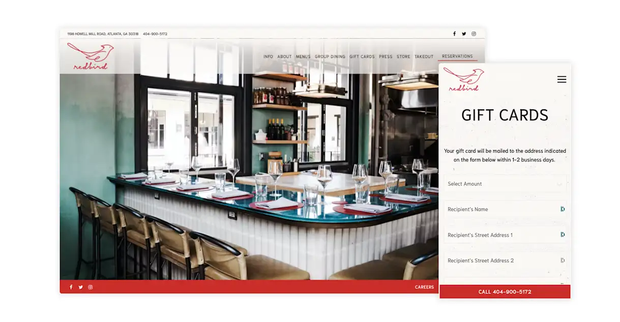 Redbird is a labor of love from chef Zeb Stevenson and Ross Jones, a pair of industry veterans who have each worked in Atlanta for more than 20 years. With airy photos and warm descriptions, the website outlines their detailed approach to hospitality, restaurant design and cooking. The website also makes it easy to buy and send digital gift cards, which is important for a restaurant that builds such an intimate connection with its guests. Especially during holiday season, this creates a valuable source of passive revenue.