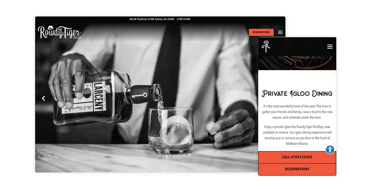 With black-and-white photography and dark, brooding design elements, Rowdy Tiger's website is a time machine back to the Prohibition era. It also does a masterful job of guiding users to high-priority pages. For example, during Black History Month, a pop-up alert informed users about a signature cocktail made with Uncle Nearest 1856, a whiskey created by the first black master distiller. At the same time, a homepage banner directed users to learn about its seasonal Winter Wonderland igloos. By strategically using these website features, Rowdy Tiger ensures its most relevant promotions get seen.