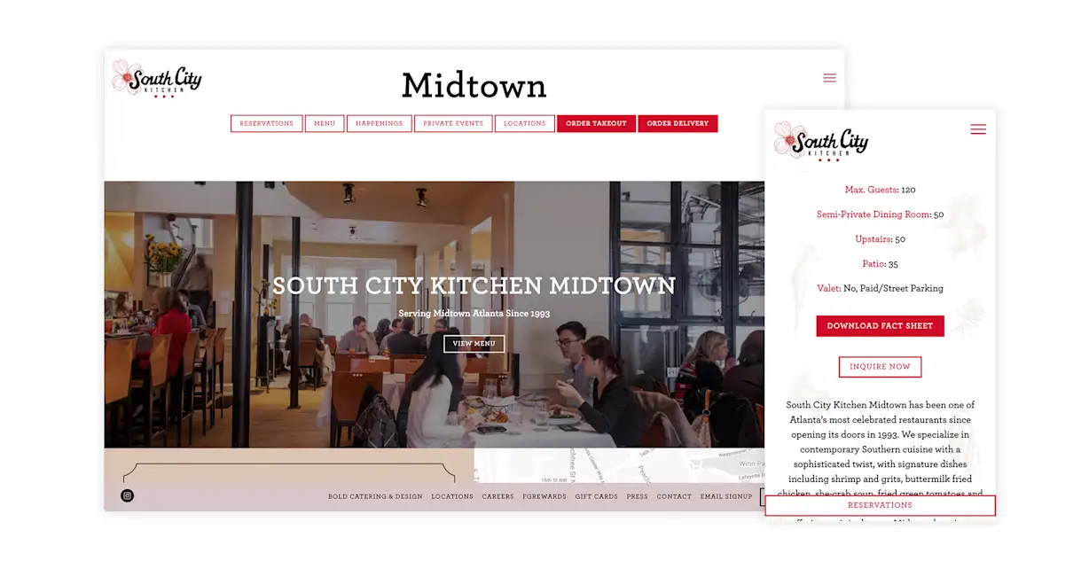 South City Kitchen serves sophisticated southern cuisine to four locations across metro Atlanta: Midtown, Buckhead, Vinings and Avalon. Its website helps guests find what they're looking for by immediately prompting them to choose between those locations, then guiding them to location-specific information. For example, each location has its own private events page, which outlines key features of the venue, provides a fact sheet and allows guests to submit online inquiries. Diners get an easy, relevant site experience, while the restaurant gets to manage all locations through one platform.