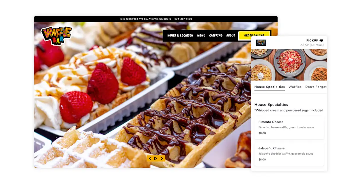 Waffle Bar, a creative chicken and waffle restaurant in East Atlanta, is known for its unique and decadent toppings. Its website captures this spirit from the moment you land on its homepage, with high-resolution photos of its syrupy, sugary creations. It also has direct online ordering that allows for custom branding, including a beautiful overhead image of colorful waffles. The visual design of the website says a lot about the restaurant, while the commerce features make it easy for guests to experience it for themselves.