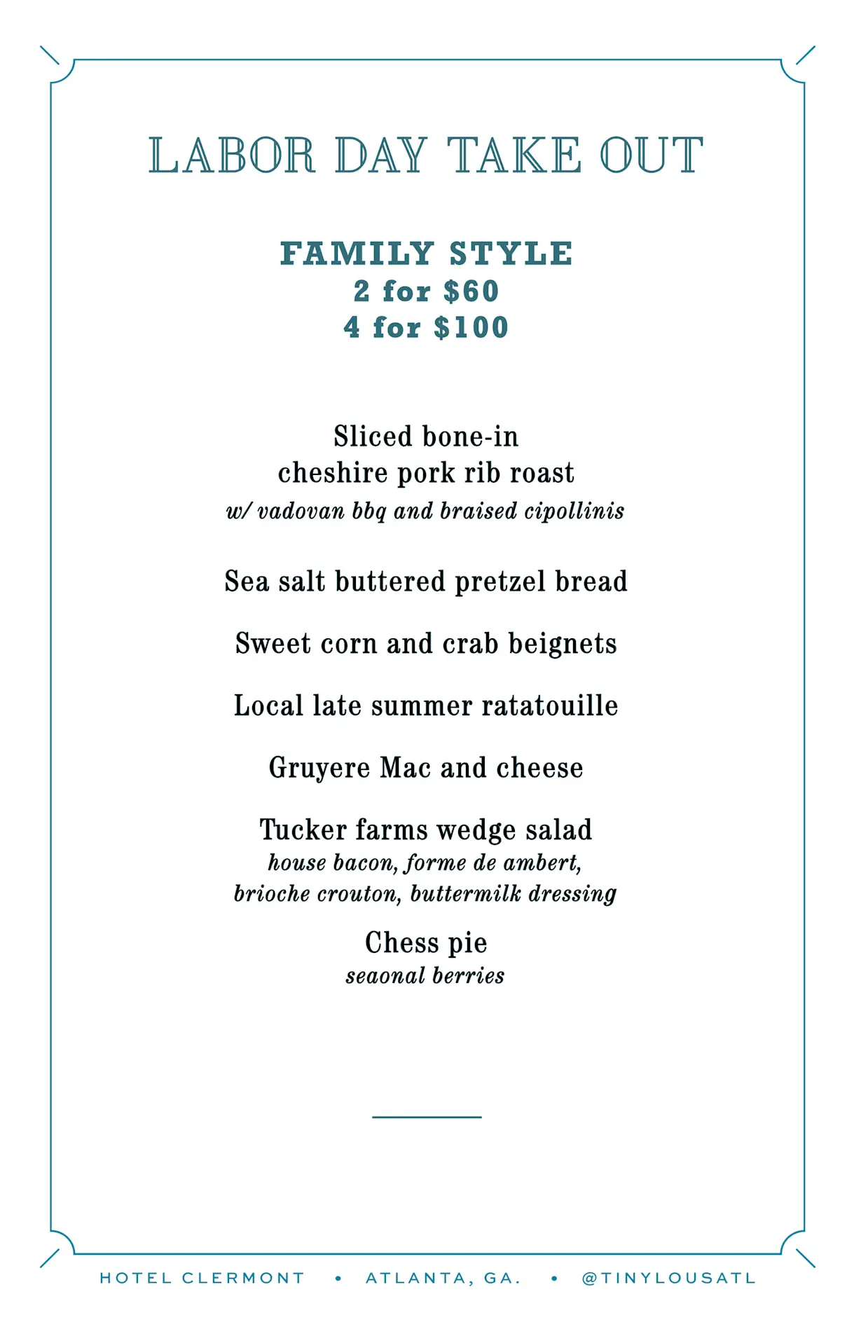 Tiny Lou’s offers family style barbecue as a takeout special for the holiday with a discount when you buy for four people. The spread includes meat, sides, and dessert.