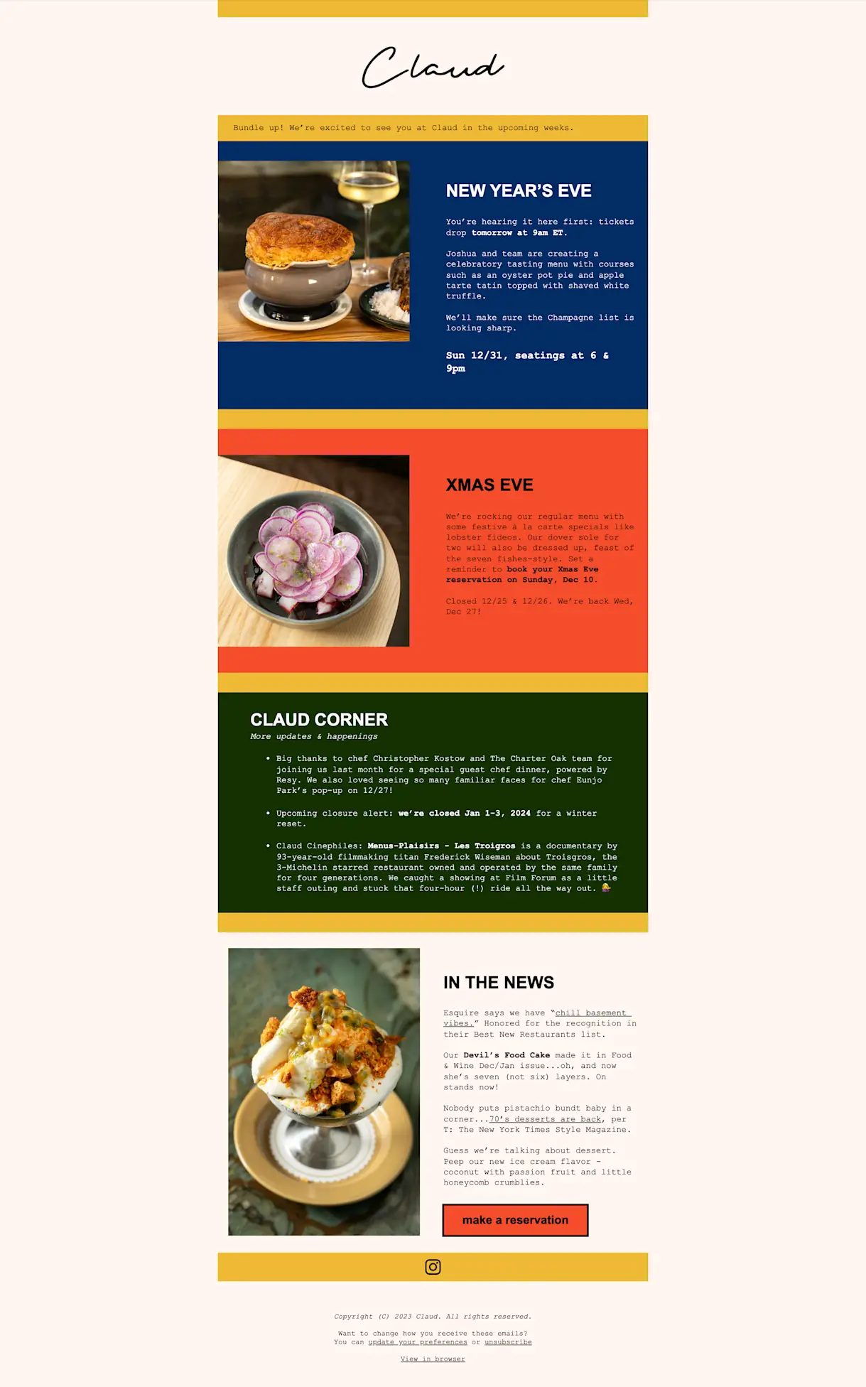 Why it works: Claud’s monthly newsletter does many things right. Firstly, it follows through on a promise of exclusivity that so many email sign-up prompts tease but often don’t deliver on. Email subscribers are the first group to get a heads up on New Year’s Eve tickets with a call-out at the top of the newsletter — “You’re hearing it here first: tickets drop tomorrow at 9am ET.” This tactic of event marketing (informing certain groups of people about opportunities before it’s made public) creates demand and will help drive better sales.