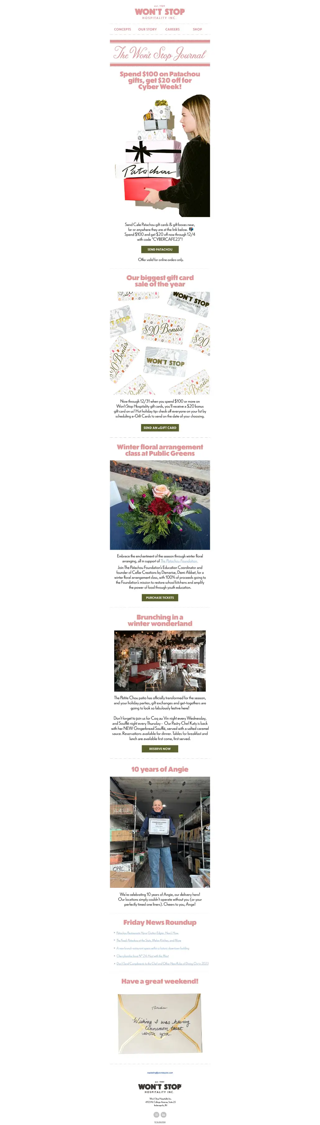 Why it works: The Won’t Stop Journal, sent by Won’t Stop Hospitality Inc., does a great job of balancing promotions with upcoming events, employee spotlights, and a link roundup in their monthly newsletter. In this example, they’re pushing their buy $100, get $20 gift card deal ahead of the holidays while also driving ticket sales for a floral arrangement class and encouraging reservations at one of their concepts that’s newly decked out in holiday decor.