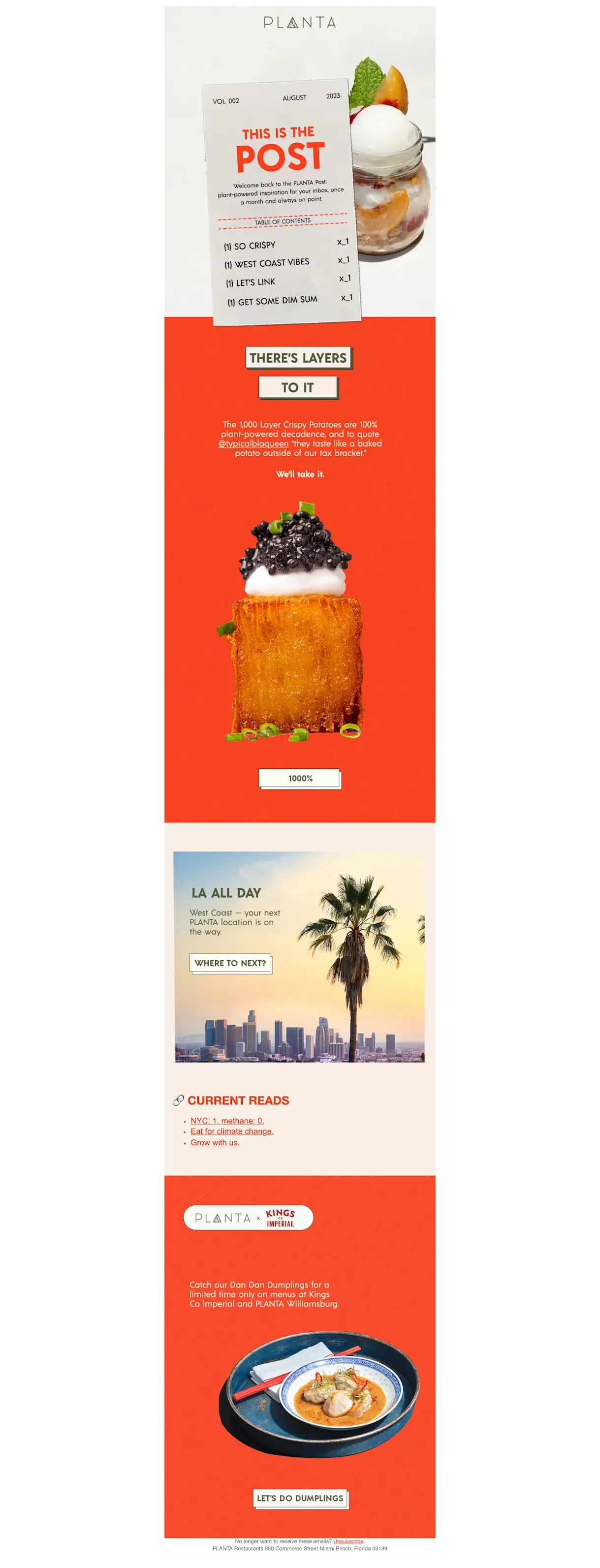 In this example, two special menu items are highlighted (say hi to the 1,000 layer crispy potatoes and dan dan dumplings) and a new location is subtly announced. The Current Reads link round-up is a mixed bag, but still on-brand, and includes a New York Times feature on climate change and the food system, industry news about mandatory composting in New York City come fall 2024, and a slightly out of place push to their job board (but hey, hiring has to fit in somewhere).