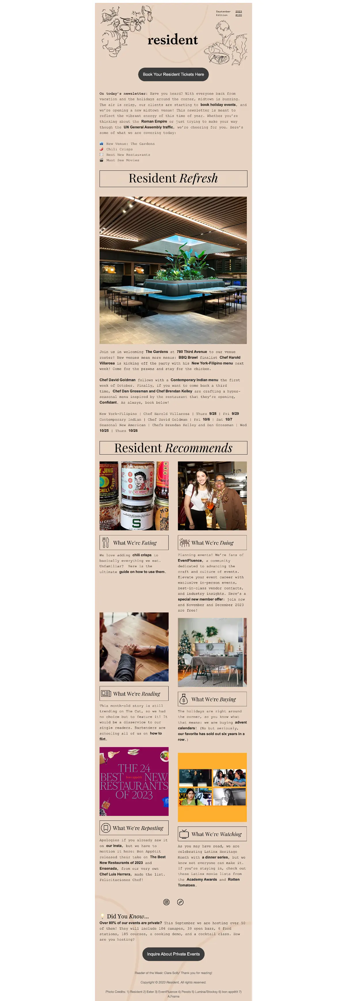The intro paragraph typically speaks to current events and pop culture as well as previews what to expect in the newsletter content. Under Resident Refresh, updates from the business are shared like new venues for pop-ups and soon-to-be chef line-ups.