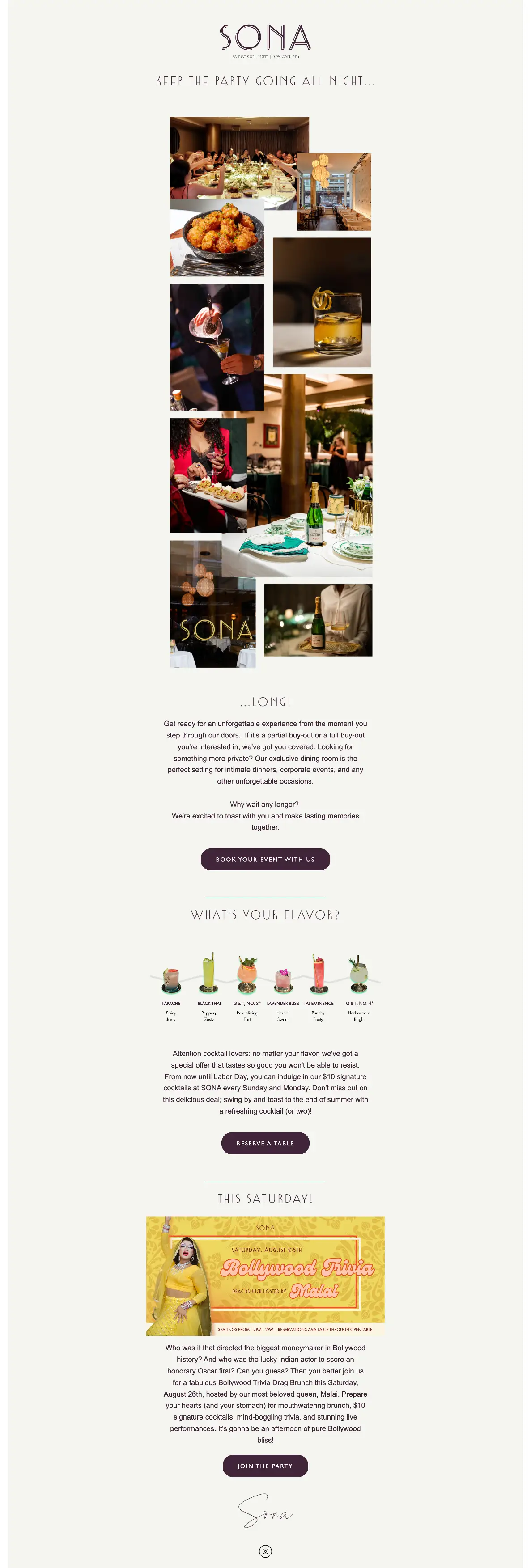 Why it works: SONA takes a more promotional approach to their newsletter — highlighting their private events and reservations — but in a way that still feels natural and fun.