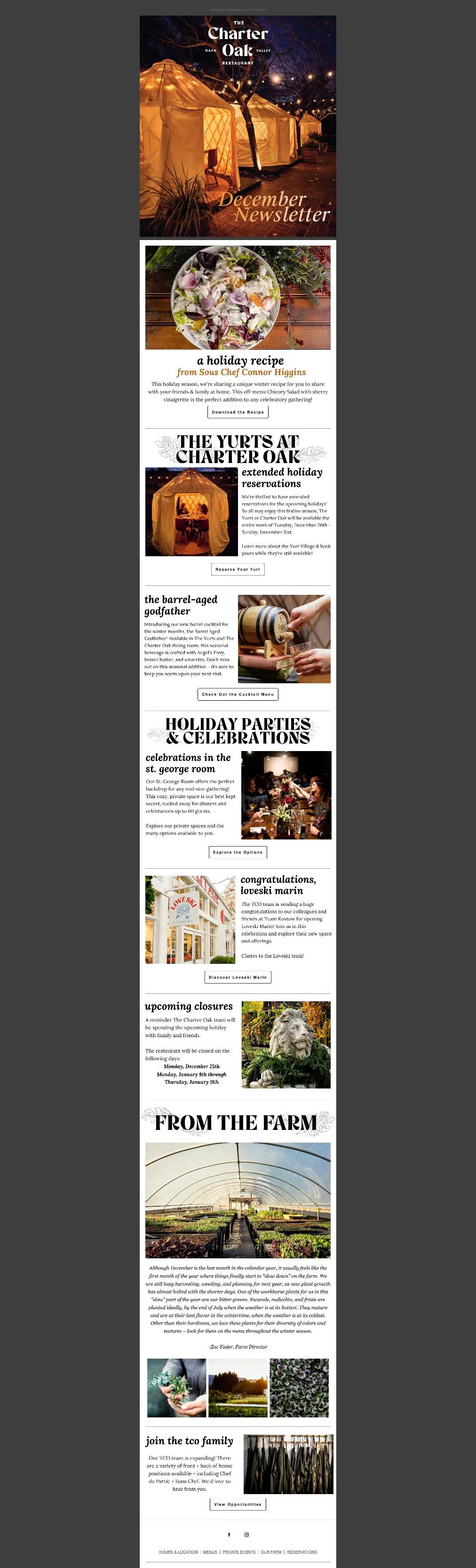 Why it works: The Charter Oak includes a mix of seasonal menu changes, private event experiences, and upcoming special events in their newsletter each month. In this one, there's a holiday recipe from their sous chef. The format is consistent and has an almost editorial feel to it.