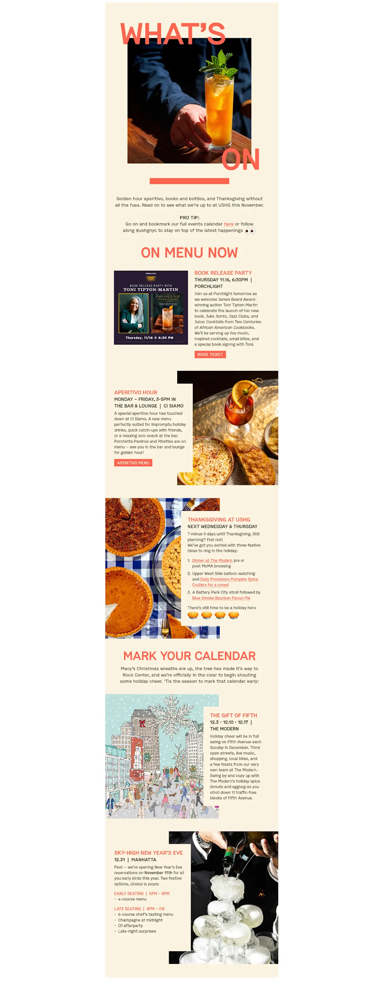 The menu newsletter has two sections: On Menu Now and Mark Your Calendar. On Menu Now is a round-up of current events, menus, and pre-order opportunities — in this case, the topics are around a book release party, an aperitivo hour menu, and Thanksgiving options. Under Mark Your Calendar, there are call-outs to future happenings (almost like save the dates) that tease what’s on the horizon for the next month.