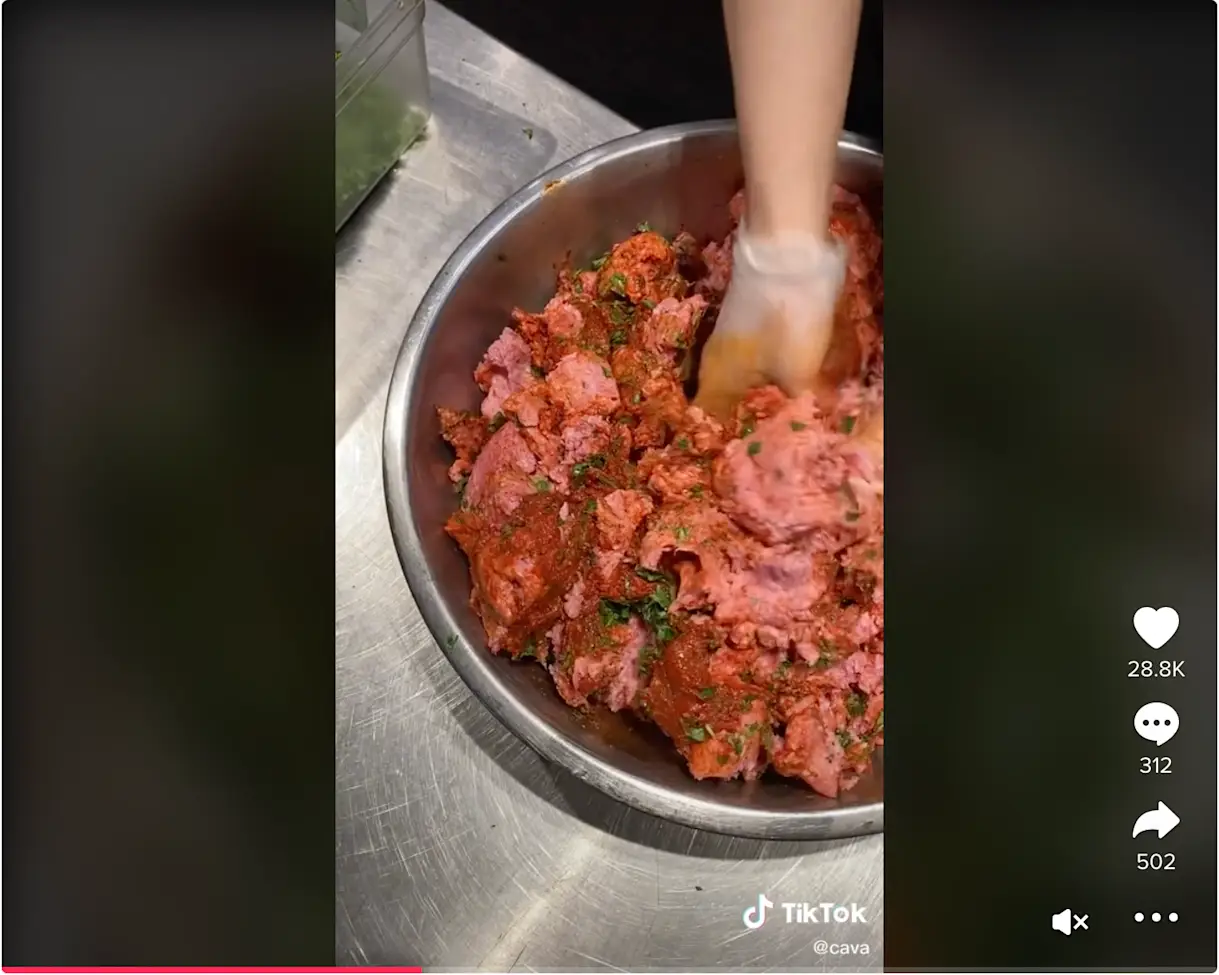 TikTok is a great place for restaurants to pull back the curtain and show what goes into meal prep. In this example, Mediterranean fast-casual chain Cava shows the entire process for how its meatballs are made — the seasoning, the mixing, the hand-rolling, the grilling and ultimately the serving.