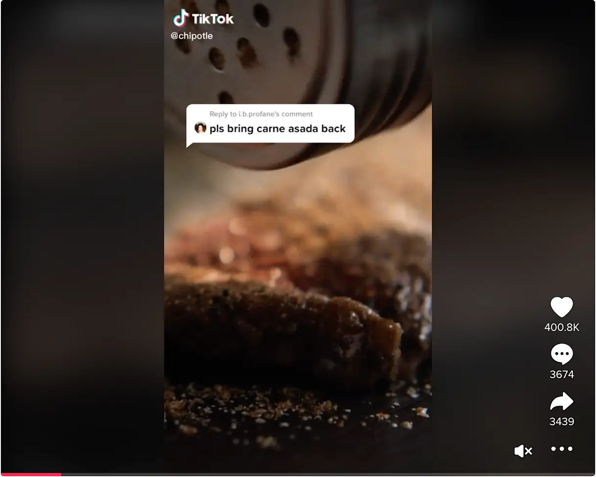 If a restaurant’s TikTok presence picks up, its videos will likely bring plenty of comments from customers and followers. One of TikTok's unique features is that a comment on one video can be used as a prompt for another video. In the example above, a customer’s wish for the return of Chipotle’s carne asada was granted — and announced to Chipotle’s massive TikTok following.