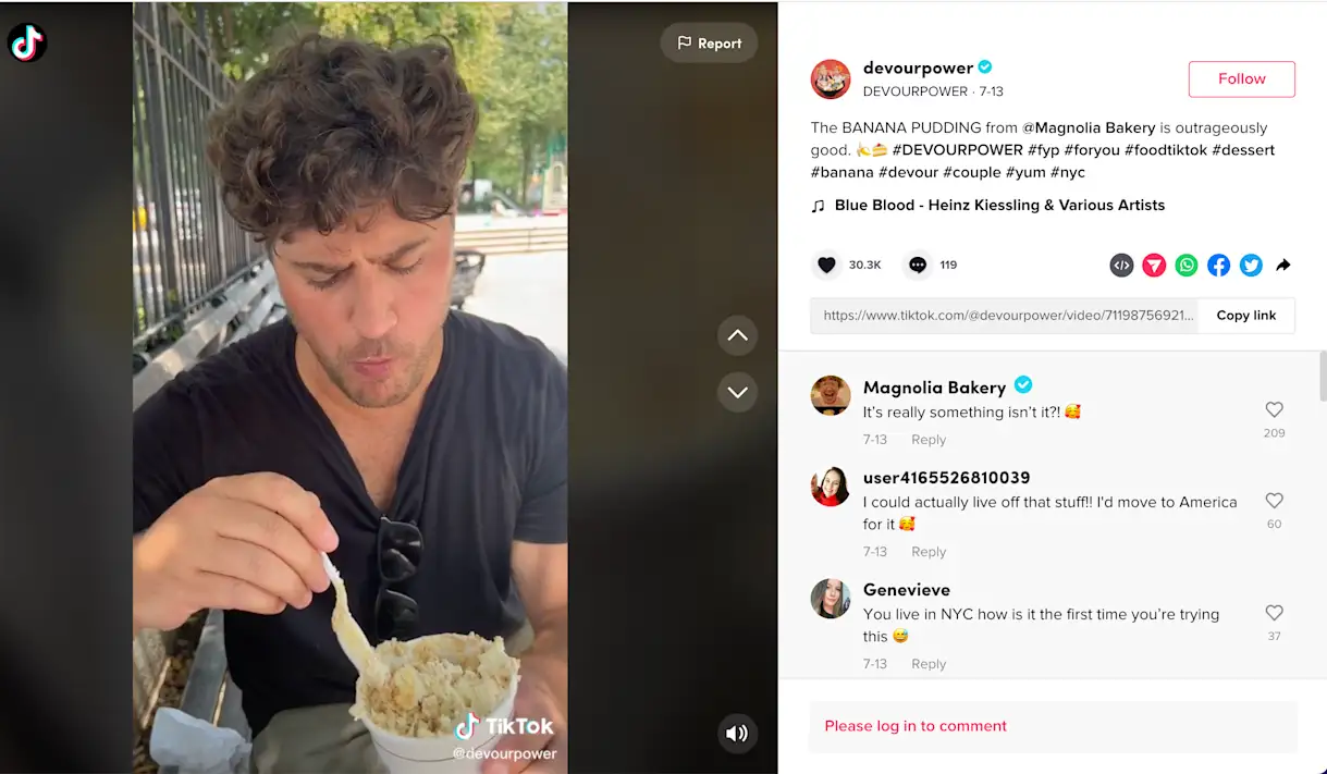 In the example above, DEVOURPOWER, an account sporting more than 1.5 million TikTok followers, recounts its experience eating Magnolia Bakery's banana pudding. This is an effective way to show trusted food influencers enjoying the restaurant’s best items and can help pique the curiosity of someone scrolling through their feed.
