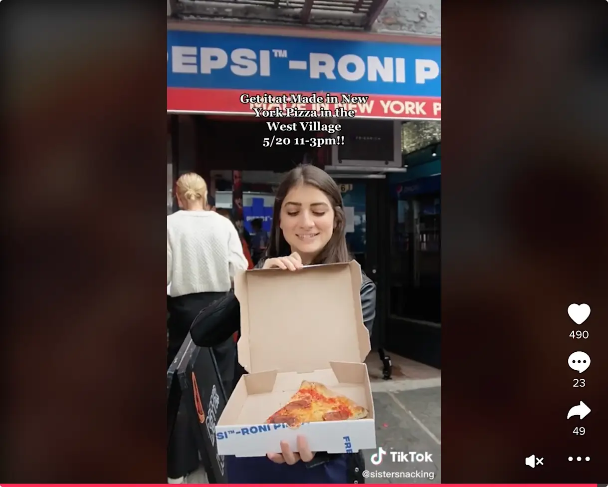 In the example above, NYC-area influencer account Sistersnacking, which has nearly 1500,000 TikTok followers, partnered up with Made in New York Pizza to promote the restaurant’s new Pepsi-infused pizza. This approach works because it generates immediate buzz for the upcoming event from a crowd of New York restaurant fanatics.