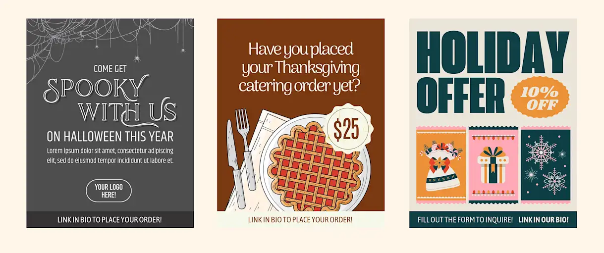 Over the holidays in 2023, 63% of adults said they were planning on visiting a restaurant. There are many ways that you can capture a diner’s attention to make your restaurant the one they visit, especially through digital marketing. Whether they’re seeing a halloween promo offer on your Instagram as a potential new customer, receiving a Thanksgiving catering email, or getting an SMS message about Holiday merch, marketing is incredibly important to keep your restaurant top of mind. Below you’ll find email, SMS, and social media templates you can use for your holiday digital marketing efforts to turn prospective customers into loyal fans.