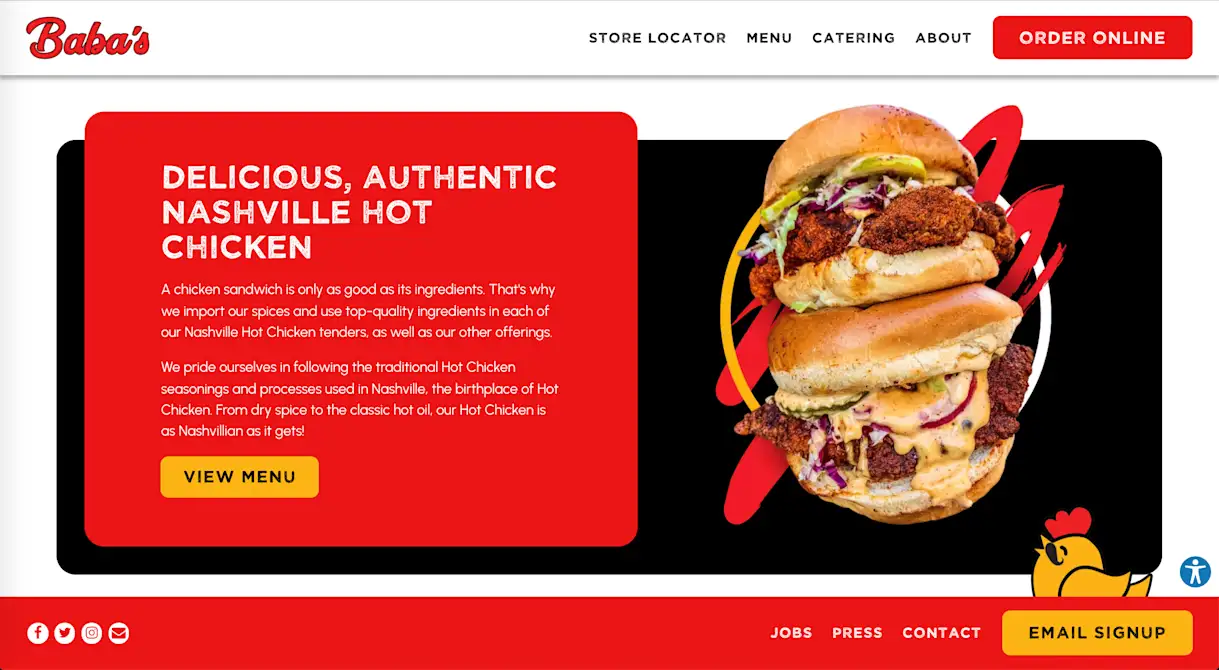 Baba's is a Nashville hot chicken chain that operates across California. In nearly every sentence, the headline and description on its homepage stress that it is authentic Nashville hot chicken — not some cheap West Coast imitation. When your restaurant has a well-defined value prop like this, the description is no place for subtlety; you want to hammer it clearly, concisely and continuously. Baba's does this with text and then validates it with loud, in-your-face, food photography.