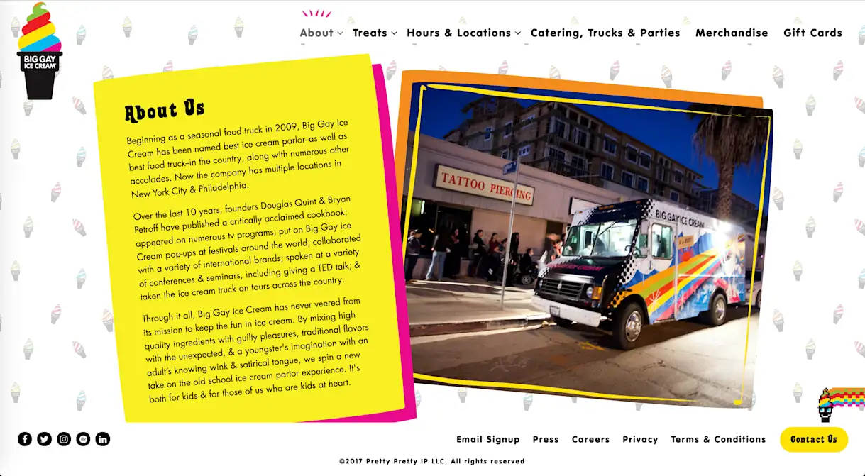 Although the style — and the business — is very different, Big Gay Ice Cream employs a similar approach to Gramercy Tavern. The first paragraph of its description explains the brand's humble origins as a seasonal food truck, which primes readers for the second paragraph, where it mentions various milestones and accolades. This description approach and the web page design, which resembles a scrapbook with polaroids, positions Big Gay Ice Cream as it wants to be positioned: a global sensation that remembers where it came from.