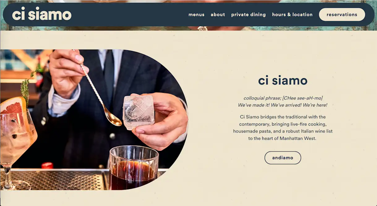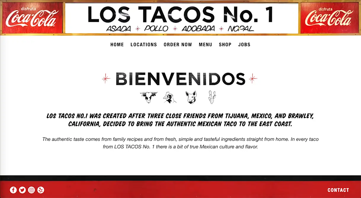 The headline welcomes guests in Spanish, and then the description switches seamlessly to English. This is a fitting introduction to Los Tacos No. 1, the brainchild of partners from both sides of the Mexican-American border, who brought their authentic recipes to New York City. The illustrations between the headline and description represent the four fillings on their menu — beef, chicken, pork and cactus — and channel the restaurant’s lighthearted character. Click the link above and you’ll see that the icons animate when users scroll past them, one of many cool design features available through the BentoBox website platform.