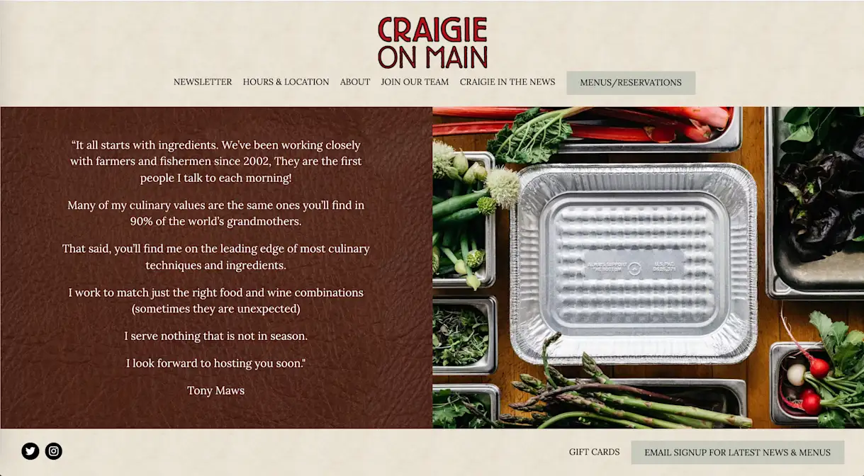 Craigie on Main's entire description is a quote from chef/owner Tony Maws. Speaking directly to the reader, Maws describes his homestyle cooking approach, explaining that farmers and fishermen are the first people he talks to each morning and comparing his culinary values to "90% of the world's grandmothers." The use of first-person perspective helps the quote come across as sincere and authentic, positioning the brand as a restaurant run by artisans.