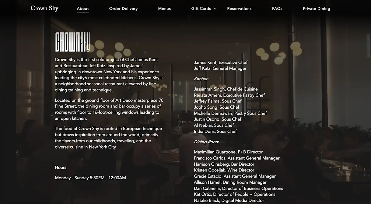 Before users even start reading, the Art Deco-inspired logo and background image establish a refined mood. The description text delivers on that mood with upscale words such as "celebrated," "elevated" and "masterpiece." Supplementing all of this, the page lists more than 20 staff members, including management, kitchen and dining room. This decision — and the decision to use the same text design as the rest of the description — shows that the restaurant's people are central to its identity, which positions the brand as personal and human.