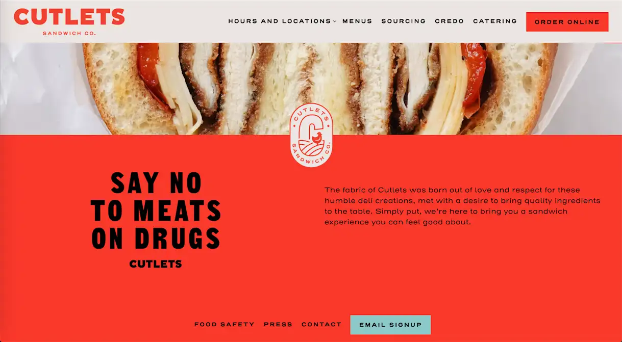 It's rare for one line of copy to accomplish so much so quickly, but when it happens, it's extremely powerful. Cutlets combines this description with a carousel of high-resolution food photography, which rounds out the homepage and leaves a strong impression on future diners.