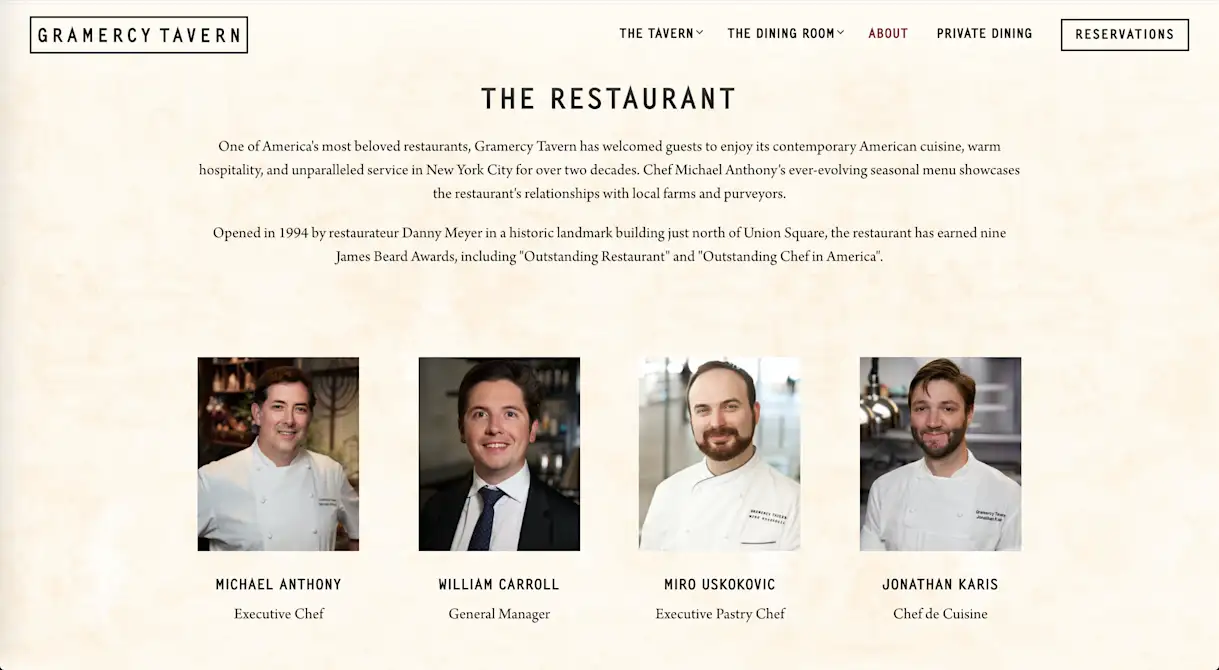 Upscale restaurants sometimes overwrite their descriptions, using flowery language that sounds posh and sophisticated but doesn't convey a clear point. Gramercy Tavern uses simple adjectives like contemporary American cuisine, warm hospitality and unparalleled service, which paint a clear picture while still projecting confidence and authority. The use of plain language in the first sentence primes readers for the second sentence, where the restaurant mentions its nine James Beard Awards in a way that feels matter-of-fact and informative, rather than arrogant and showy.