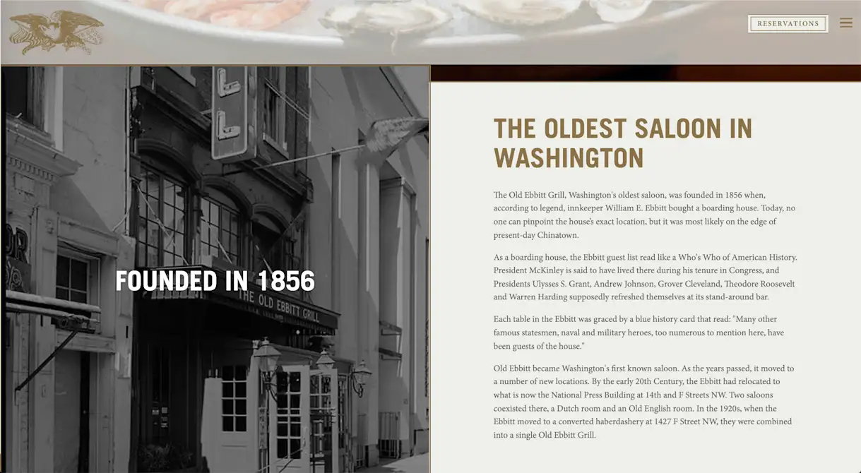 Like Bubby's, Old Ebbitt Grill uses its headline to make a specific claim that paints a vivid picture. This claim — "The oldest saloon in Washington" — is even bolder and more eye-catching, especially with the black-and-white photo beside it. The description delivers on the promise of the headline, listing the U.S. presidents who have frequented the famous saloon. Instead of explicitly stating, "Old Ebbitt Grill has a rich history," this approach paints a picture that helps people feel the history.
