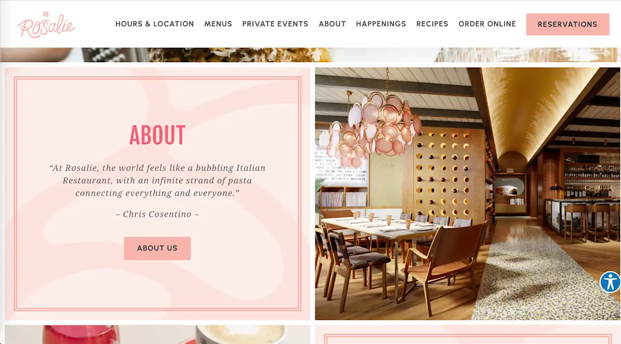 Rather than a long, manifesto-style pull quote, Rosalie's homepage features a short, abstract thought from chef/owner Chris Cosentino. The quote does provide some important information — establishing Rosalie as a "bubbling Italian restaurant" — but more than that, it adds a dash of whimsy to Rosalie's brand. It's a captivating description that makes users want to learn more, which they can do by clicking "About Us" for a longer description or coming in to experience the space firsthand.