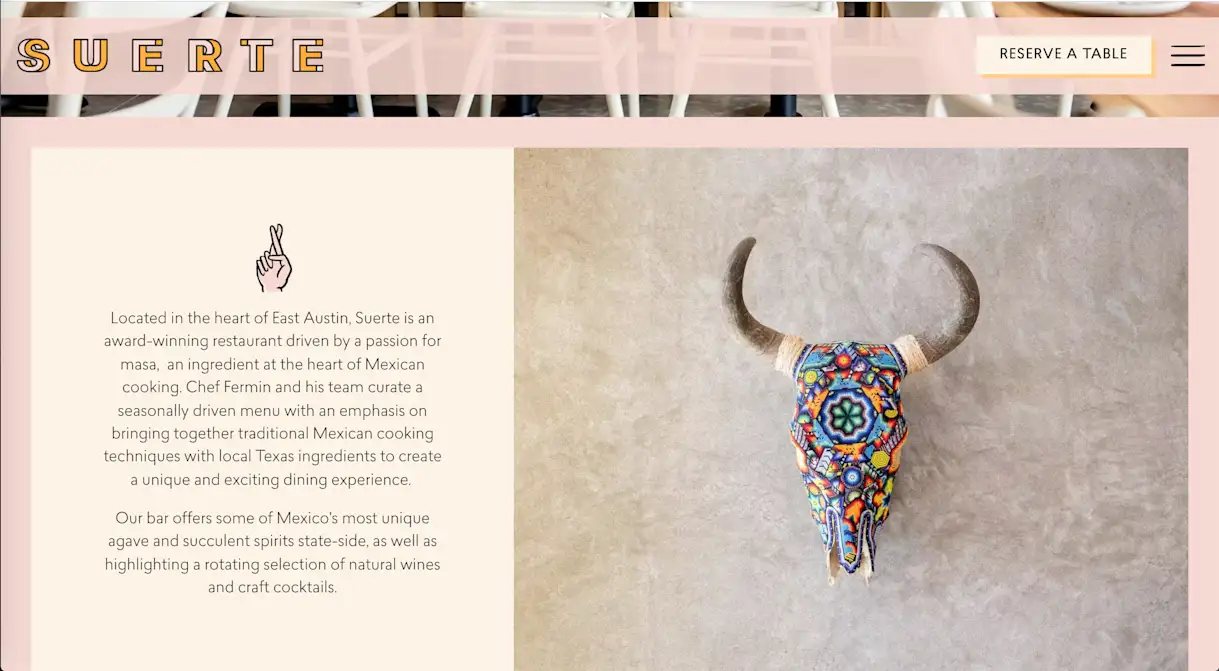The first sentence of the description clearly outlines something unique about the restaurant: its passion for masa. This establishes the "traditional" component of Suerte's menu, which blends traditional Mexican cooking with local Texas ingredients. The photo beside the description further amplifies this idea, showcasing traditional Mexican art while establishing a bright, exuberant visual style for the brand. When image and text work in harmony like this, it can be extremely powerful.