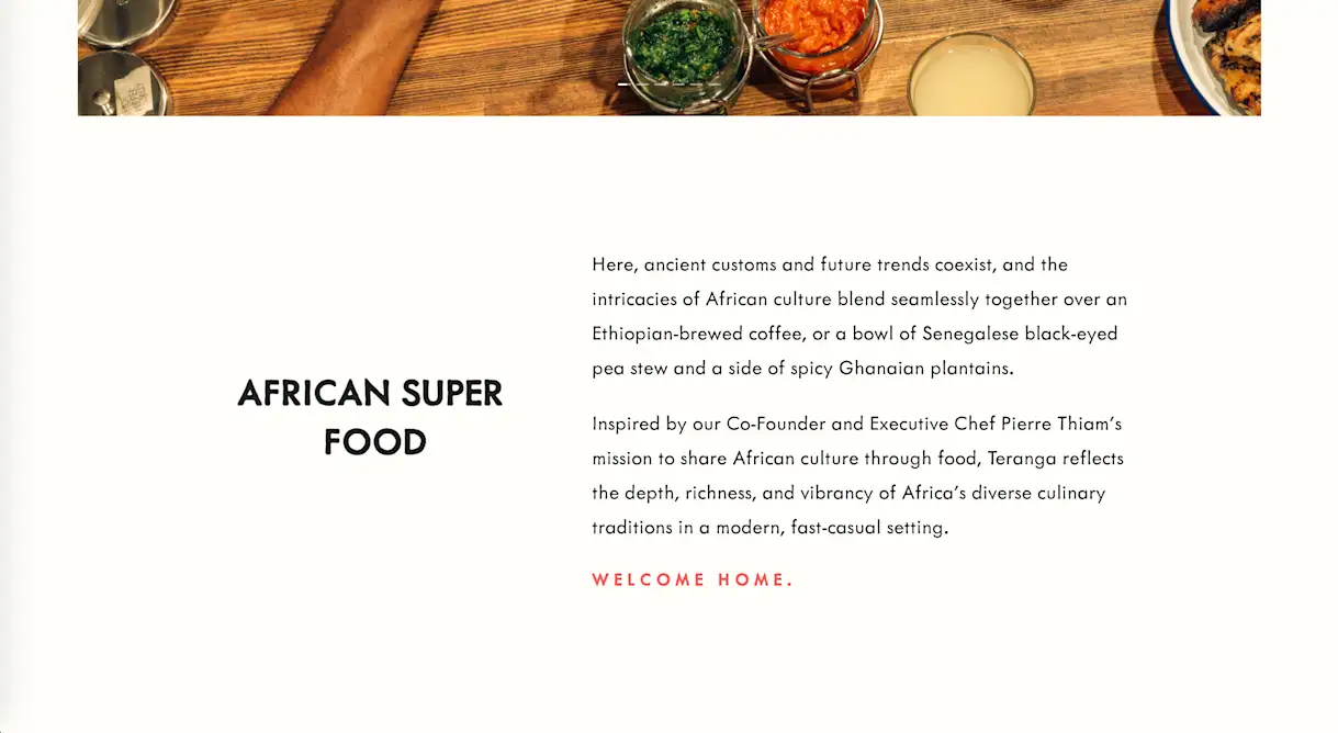 After capturing attention with the headline, the first sentence of the description gives three examples of menu items, each one using a different African country in the adjective: Ethiopian-brewed coffee, Senegalese black-eyed pea stew, Ghanaian plantains. This is a deft illustration of the menu concept, which blends the diverse tastes of African cuisine into one cohesive experience. The description also ends with an inviting piece of copy, "Welcome Home," that stands out due to colorful text design.