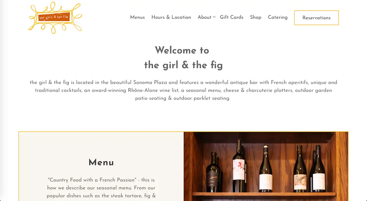 the girl & the fig is located in the beautiful Sonoma Plaza and features a wonderful antique bar with French aperitifs, unique and traditional cocktails, an award-winning Rhône-Alone wine list, a seasonal menu, cheese & charcuterie platters, outdoor garden patio seating & outdoor parklet seating.