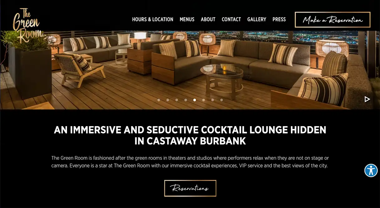 The headline leads with descriptive words like "immersive," "seductive" and "hidden," which draw the user in and make them want to learn more. The description then delivers on that intrigue, explaining that the lounge is fashioned after backstage green rooms in theaters and on movie sets. That's a bold claim, but the full-bleed photos of the restaurant's sprawling views, along with the gold trims and fonts throughout the website, help position The Green Room as a place where regular people feel like stars.