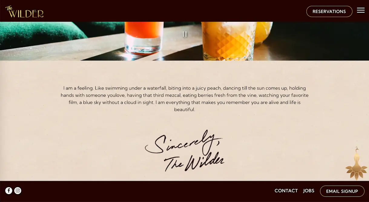 Even more than Death & Co., this description uses literary prose to read like a call to adventure. It is extremely avant-garde, framed like a letter from The Wilder to the reader, comparing the upscale lounge to a list of free-spirited actions like "dancing till the sun comes up" and "eating berries fresh from the vine." This approach would fall flat for many restaurants, but for a South Florida nightlife spot that appeals to guests through emotion more than reason, it's spot on. A plain description of the lounge space is the approach that would fall flat.