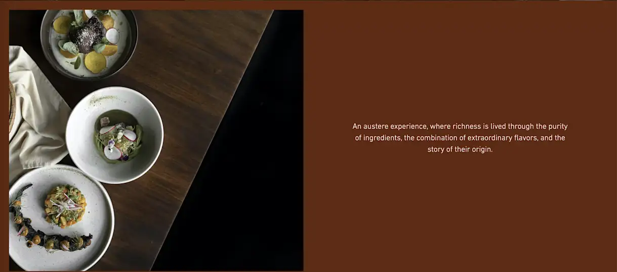 This example is best viewed at the link above, where you can see how it uses scrolling to break up the text. Although readers only see one piece of the description at a time, it reads like one cohesive thought. This unique approach to telling the restaurant's story primes users for what Tzuco promises: an imaginative meal where the story of the food is central to the experience. Describing Chef Gaytán's mind as an "Imaginarium" adds even more whimsy and intrigue.