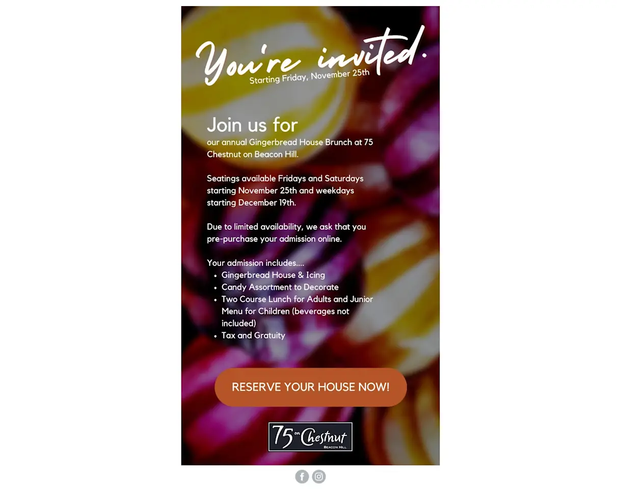 Are you selling tickets to restaurant events? Maybe you’re hosting a wine dinner, cooking class, holiday pop-up or a special brunch. Promote the event through email marketing. A neighborhood spot in Boston, 75 Chestnut, tapped into its email list to share details about their annual Gingerbread House Brunch that’s offered throughout November and December. Incorporating questions and the name of the event into the subject line performs well for these types of emails.