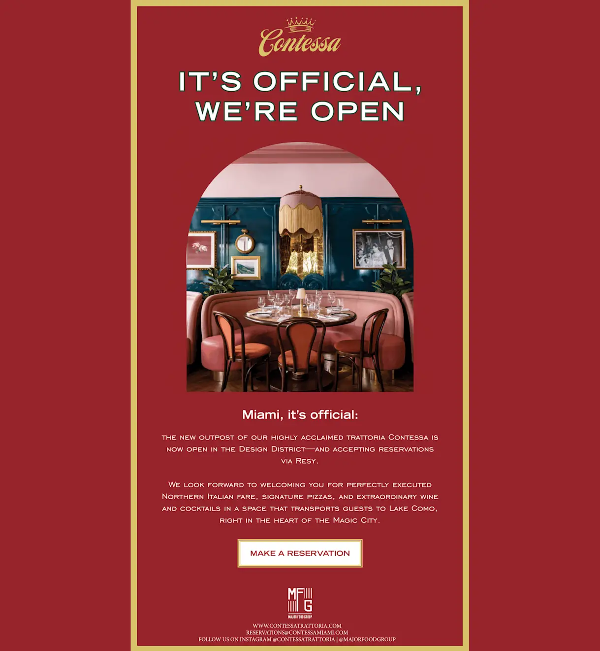NYC-based restaurant group Major Food Group announced that their popular trattoria in Boston called Contessa is opening a location in Miami. A singular call to action to “Make a Reservation” that’s highly visible and differentiated from the rest of the email — notice how the white button stands out — further makes this a shining example.