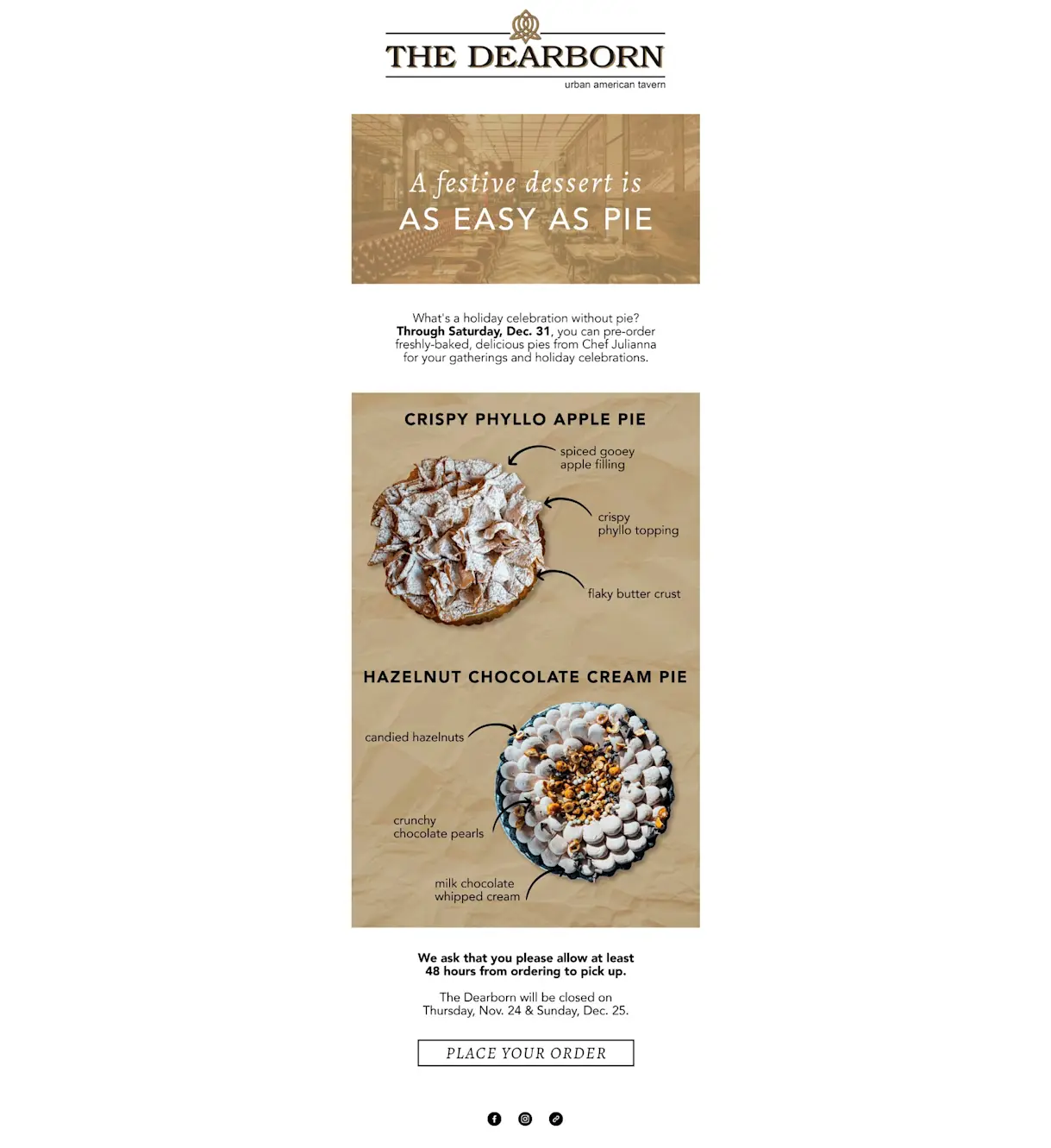 Pre-orders and catering make great calls to action (CTAs) in your email campaign, and you can directly track the number of orders generated from your email marketing efforts. In this example, Chicago’s Dearborn Tavern calls for holiday pie pre-orders. The email mentions the restaurant’s pastry chef that makes the subscribers feel like insiders, and the ingredient call-outs add descriptiveness to the imagery.