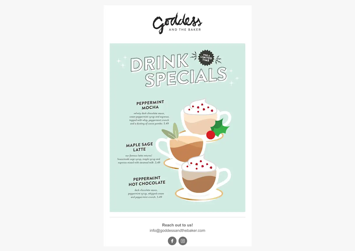 Chicago-based Goddess and the Baker does this well with the announcement of its holiday drink specials. The email has beautiful graphics, prominent drink names and detailed descriptions.