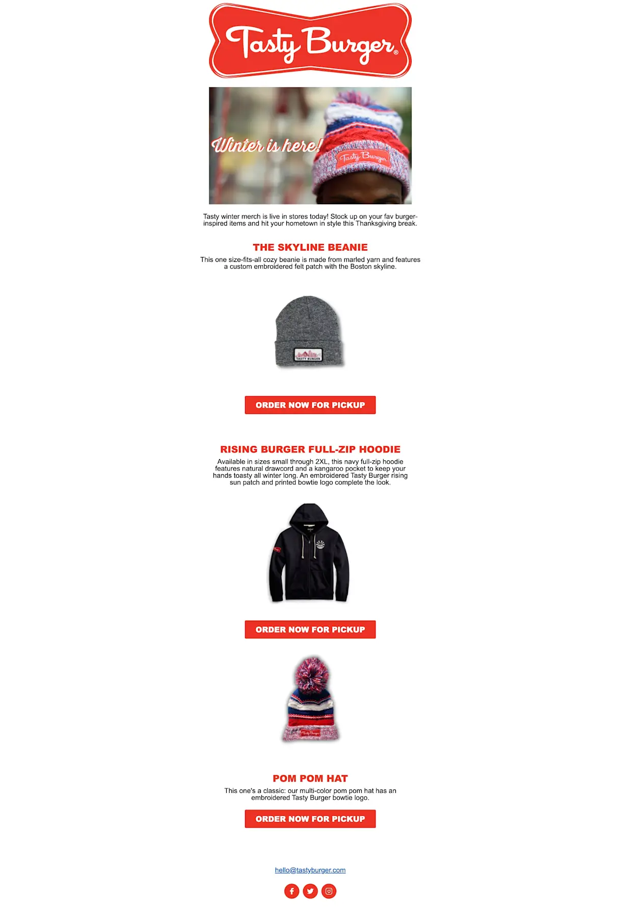 Restaurants, coffee shops and bakeries can share their seasonal menus and specials with email subscribers. Unveiling a line-up of holiday drinks? Transitioning from your winter menu to spring menu? Keep your email list in the know with an informative email that’s equal parts exciting and to-the-point.
