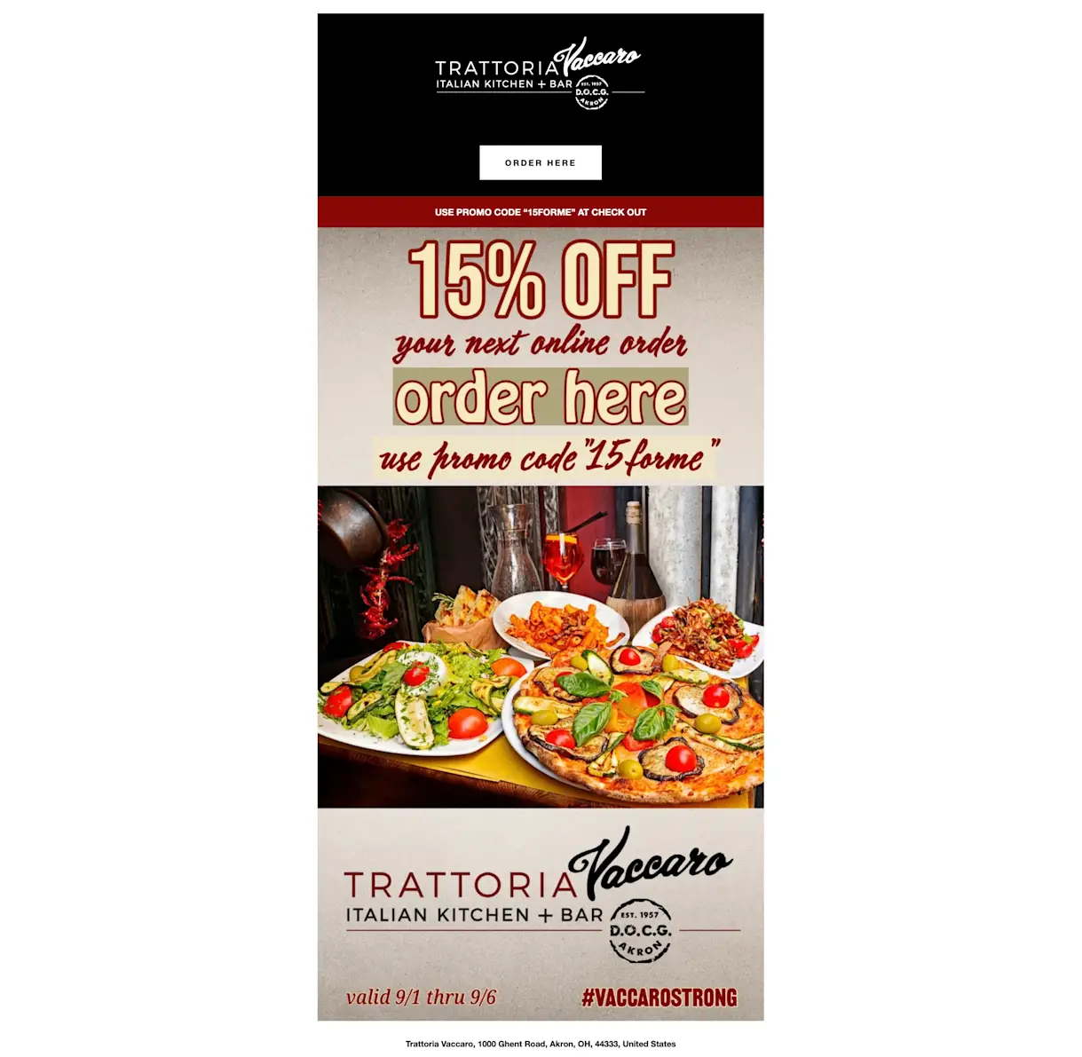 To create an incentive to place an online order, restaurants can offer a discount in their email campaigns. Here, Trattoria Vaccaro offers 15% off a customer’s next online order with a special promo code.