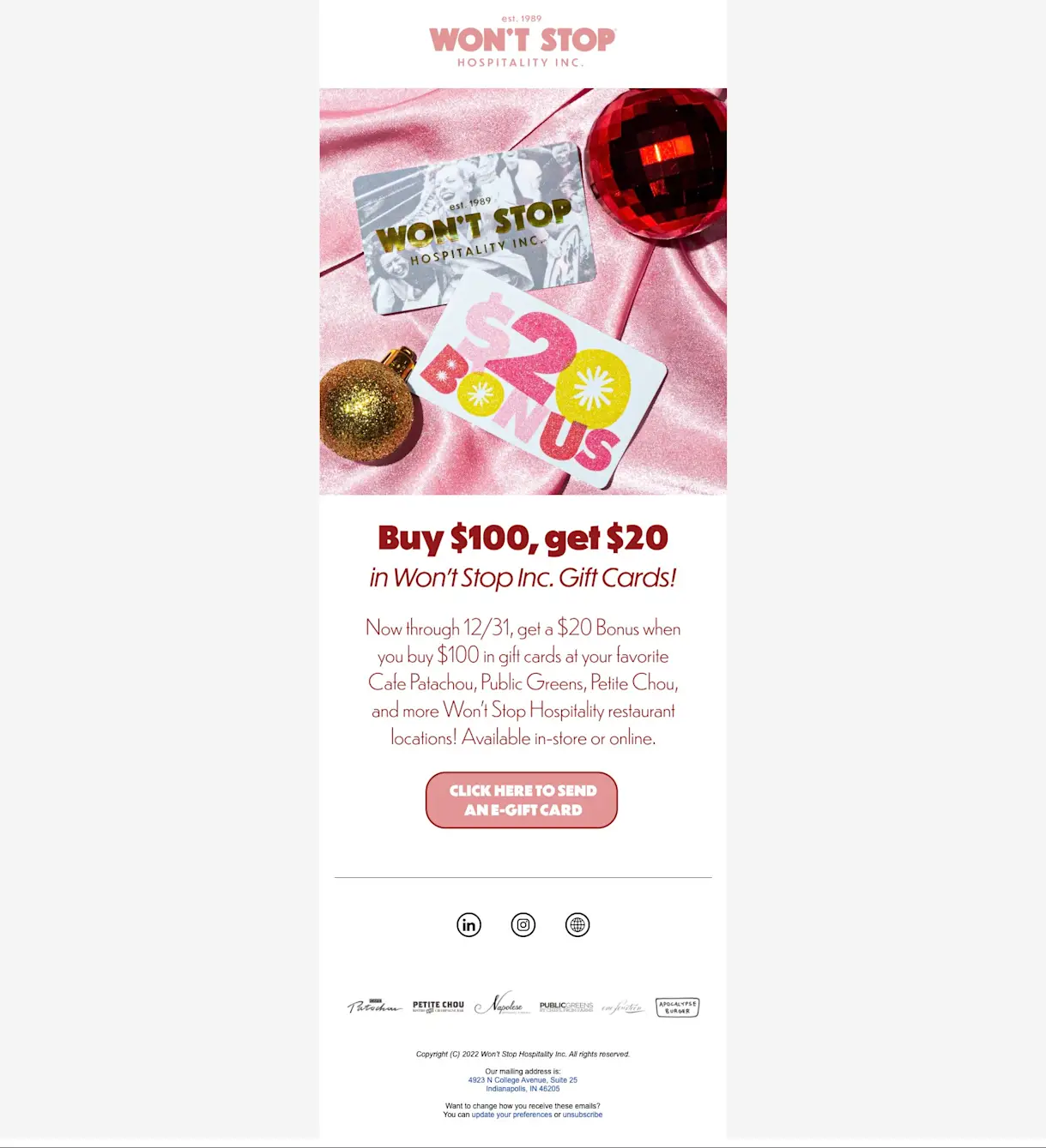 In this example, Indianapolis hospitality group Won’t Stop Hospitality promotes a gift card deal that runs from Thanksgiving through New Year’s Eve: $20 free when you purchase $100 in gift cards. Hospitality groups may consider an email like this when a promotion is available across multiple concepts under the same hospitality group umbrella.