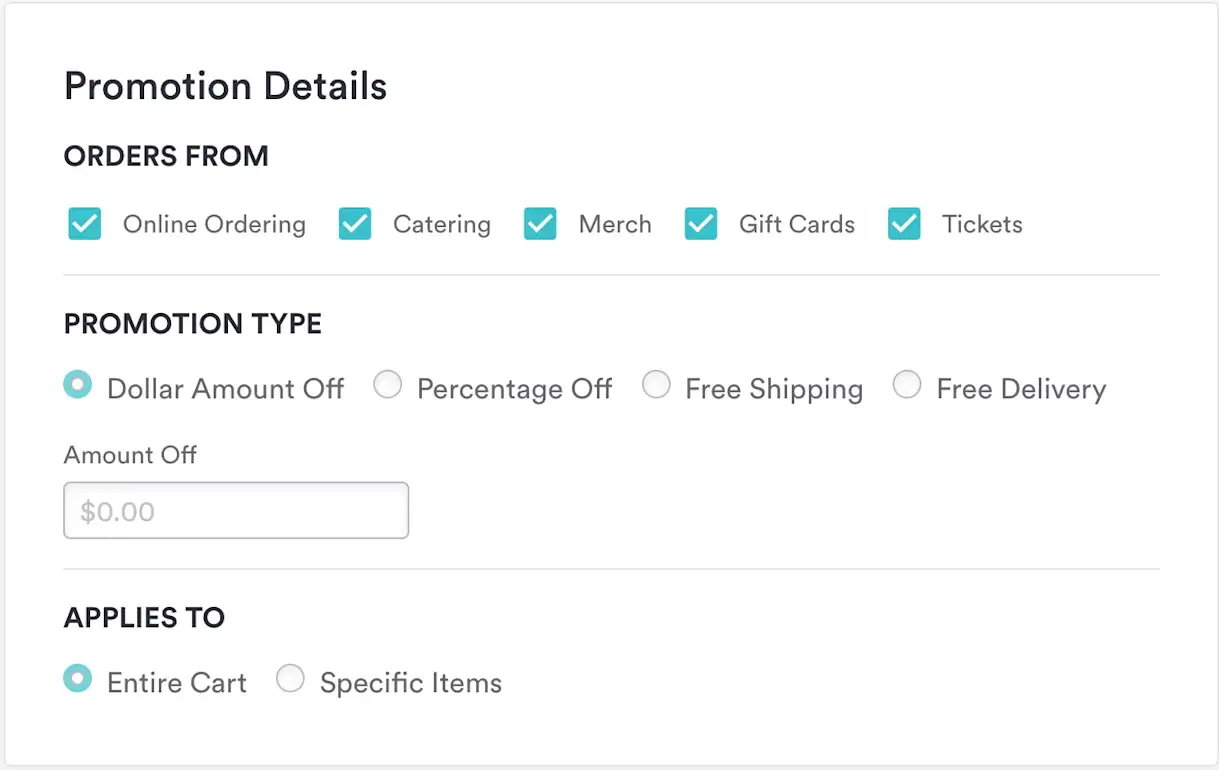 Three types of discounts are commonly applied to restaurant promotions: dollar amount off, percentage off, or free shipping/delivery.