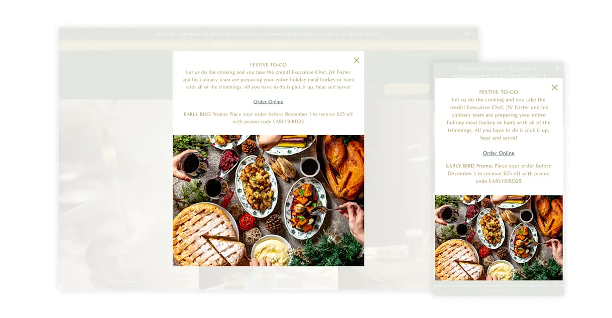 Reign, a Canadian brasserie, promotes holiday catering packages on its website and uses pop-up alerts to notify visitors about its “Early Bird Promo.” If diners place a catering order before December 1st and use the promo code EARLYBIRD25 at checkout, they receive $25 off their order.