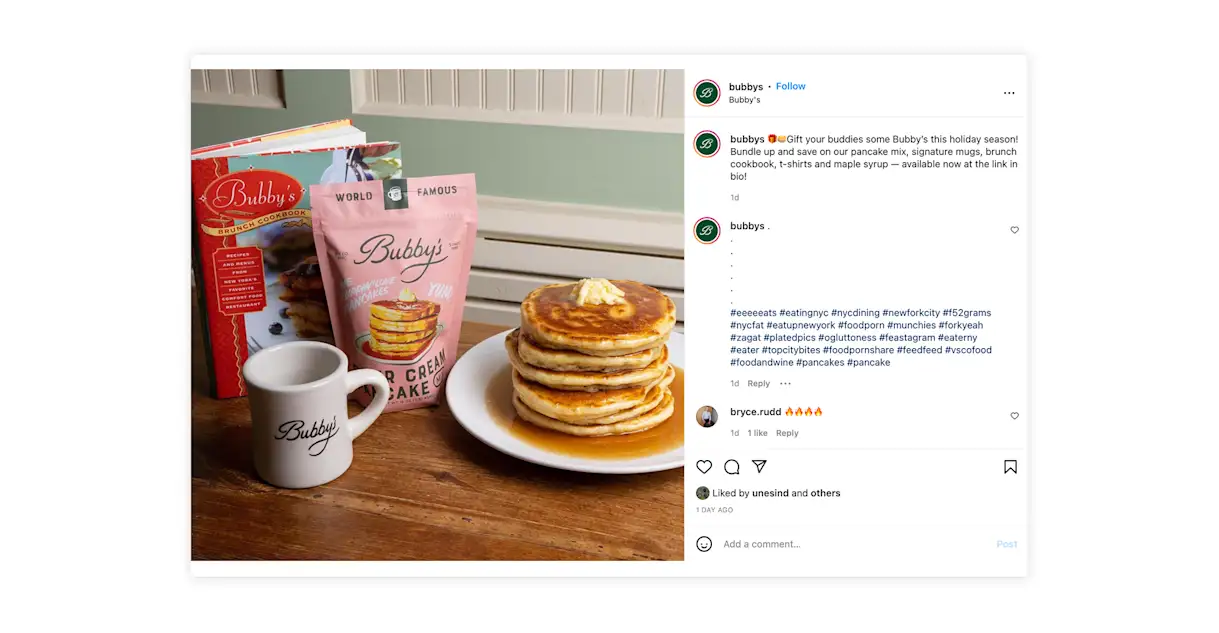 For example, New York City restaurant Bubby’s curates holiday bundles and promotes them with beautiful photographs on Instagram. Each bundle includes a variety of merchandise like cookbooks, mugs, t-shirts and its beloved sour cream pancake mix (below). Creating bundles and baskets makes gifting easier for customers, and it encourages them to spend more because they're purchasing multiple products — similar to a combo meal or a prix fixe menu.