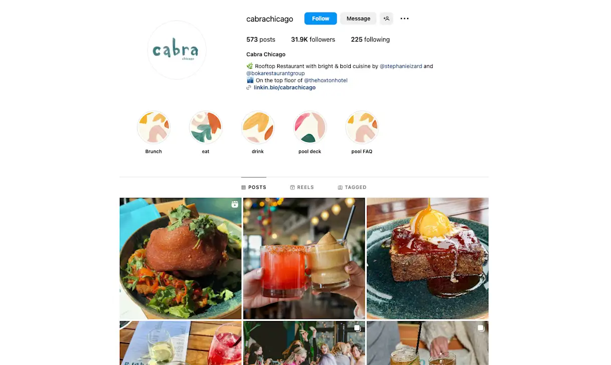 Here’s an example of a perfectly optimized Instagram profile from Cabra Chicago that’s filled with a descriptive bio (including mention of their chef and restaurant group), a branded Link in Bio and saved Stories across the top with custom designs.