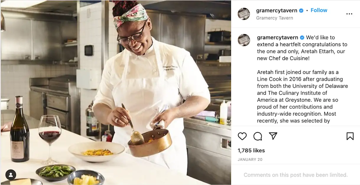 Staff highlights come in many forms. At high-end eateries, a formal introduction of who masterminded the meal adds a personal touch to the dining experience. New York’s Gramercy Tavern does this in the example above, highlighting the Chef de Cuisine’s role, education and accomplishments. More casual restaurants might want to do a less formal staff intro, or even sit them down for a Q&A for an Instagram Story or Live.